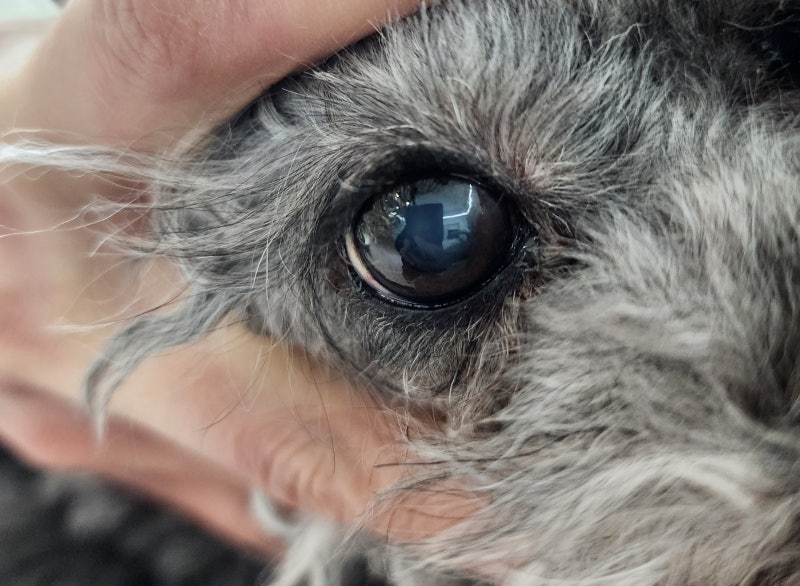 눈 (동공) 색상 변화는 약간 회색의 흰색 또는 푸르스름한 빛으로 시작되며, 흰색으로 점차 흐릿해질 수 있습니다. 자연광이나 조명에서 개 눈을 보면, 이전보다 흐린 것처럼 보이면 시력 장애로 인한 행동 변화에 가구 나 계단에 부딪 칠 가능성이 더 높습니다. 위아래로 내려가는 것은 주저하는 것처럼 보일 수 있습니다.